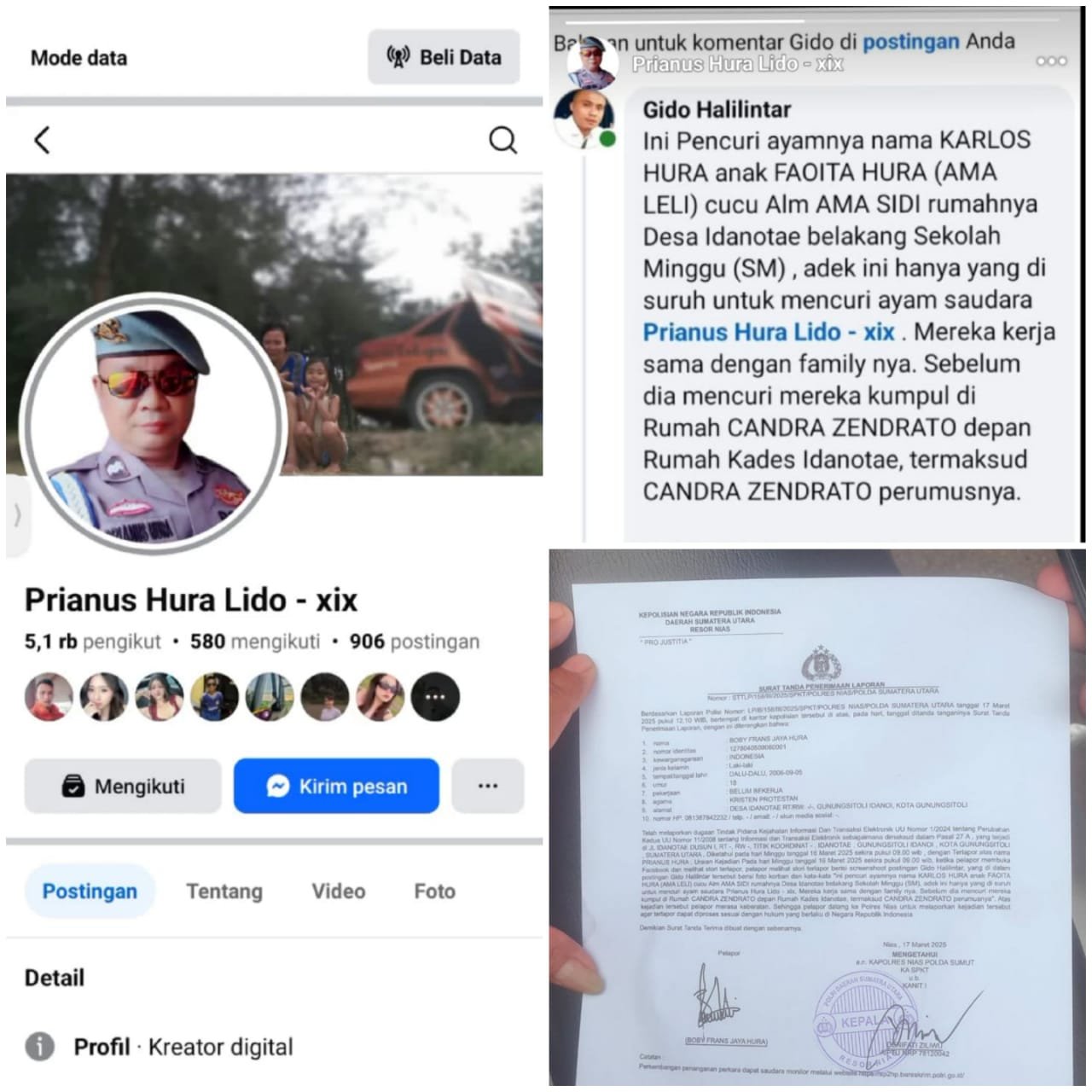 Akun FB yang atas nama Prianus Hura Lido – xix dilaporkan di Polres Nias atas komentar dalam akun FB tersebut menyampaikan ( ini pencuri ayamnya nama Karlos hura anak faoita hura (Ama Leli) cucu Alm Ama sidi rumahnya Desa idanotae belakang Sekolah Minggu (SM), adek ini hanya yang disuruh untuk mencuri ayam saudara Prianus Hura Lido – xix. Mereka kerja sama dengan familynya. Sebelum dia mencuri mereka kumpul dirumah Candra Zendrato depan rumah kades idanotae, termasuk Candra Zendrato perumusnya).
